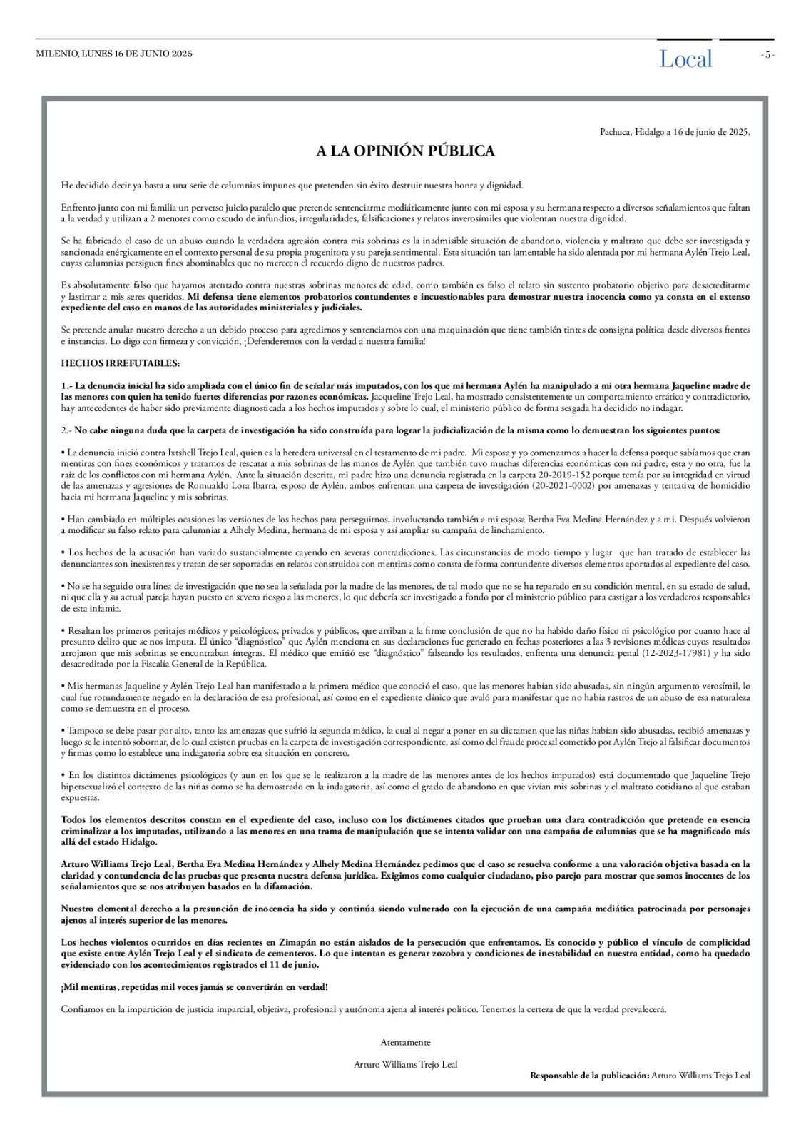 En el documento dirigido a la opinión pública, aseguró que las imputaciones carecen de sustento y forman parte de una campaña de calumnias impulsada por su hermana Aylén Trejo Leal, con motivaciones económicas y políticas.