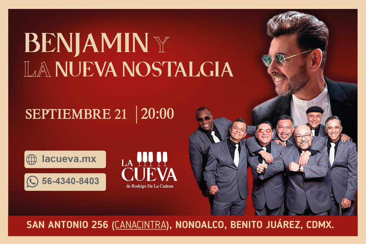 Este sábado 21 de septiembre a las 8:00 p.m., La Cueva de Rodrigo de la Cadena será el escenario de una noche memorable con la presentación de Benjamín y La Nueva Nostalgia. Este evento es muy esperado por los amantes de la música romántica y el bolero, quienes disfrutarán de una velada cargada de emotividad, con grandes éxitos que han marcado varias generaciones. Boletos a la venta en lacueva.mx