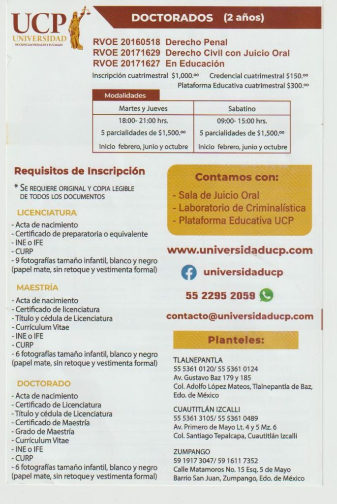 La Universidad de Ciencias Penales y Sociales (UCP) tiene una oferta educativa diseñada para satisfacer las necesidades de capacitación y actualización en las áreas Penales y Sociales de Derecho, Criminología y Educación.