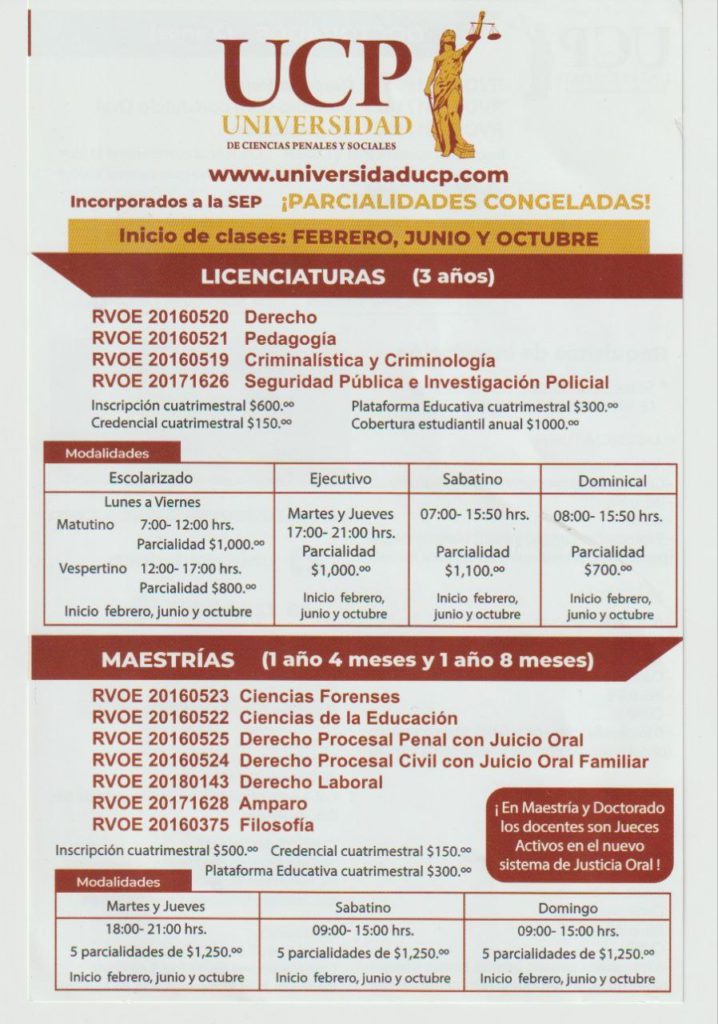 La Universidad de Ciencias Penales y Sociales (UCP) tiene una oferta educativa diseñada para satisfacer las necesidades de capacitación y actualización en las áreas Penales y Sociales de Derecho, Criminología y Educación.