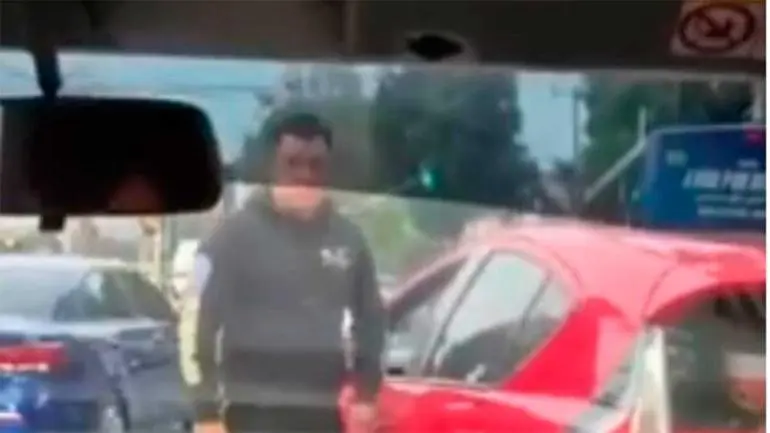 El agresor, conductor de un vehículo Toyota rojo, golpea el vidrio de una de las ventanas del vehículo de las víctimas exigendo la reparación por “el golpe”, mientras que uno de los aludidos llama aparentemente a las autoridades,
