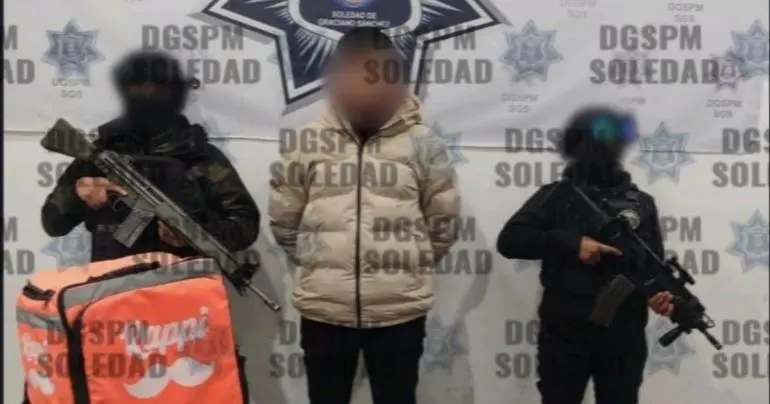 Un hombre que trabajaba para una plataforma de entrega de comida fue detenido con decenas de dosis de marihuana en el municipio de Soledad de Graciano Sánchez, en San Luis Potosí.